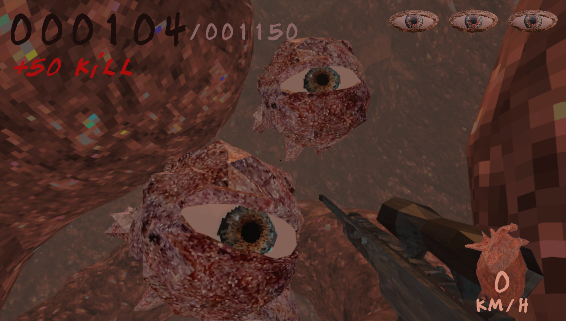 This entry into the jam is an arcade arena "trickshot" shooter in the style of a grotesque psx horror game, for this project me and my partner wanted to aim for a satisfying core game loop that fit with the Jams theme as "slick" for this we decided to do a trickshot based wave shooter game where the player scores points depending on the style and amount of tricks.
